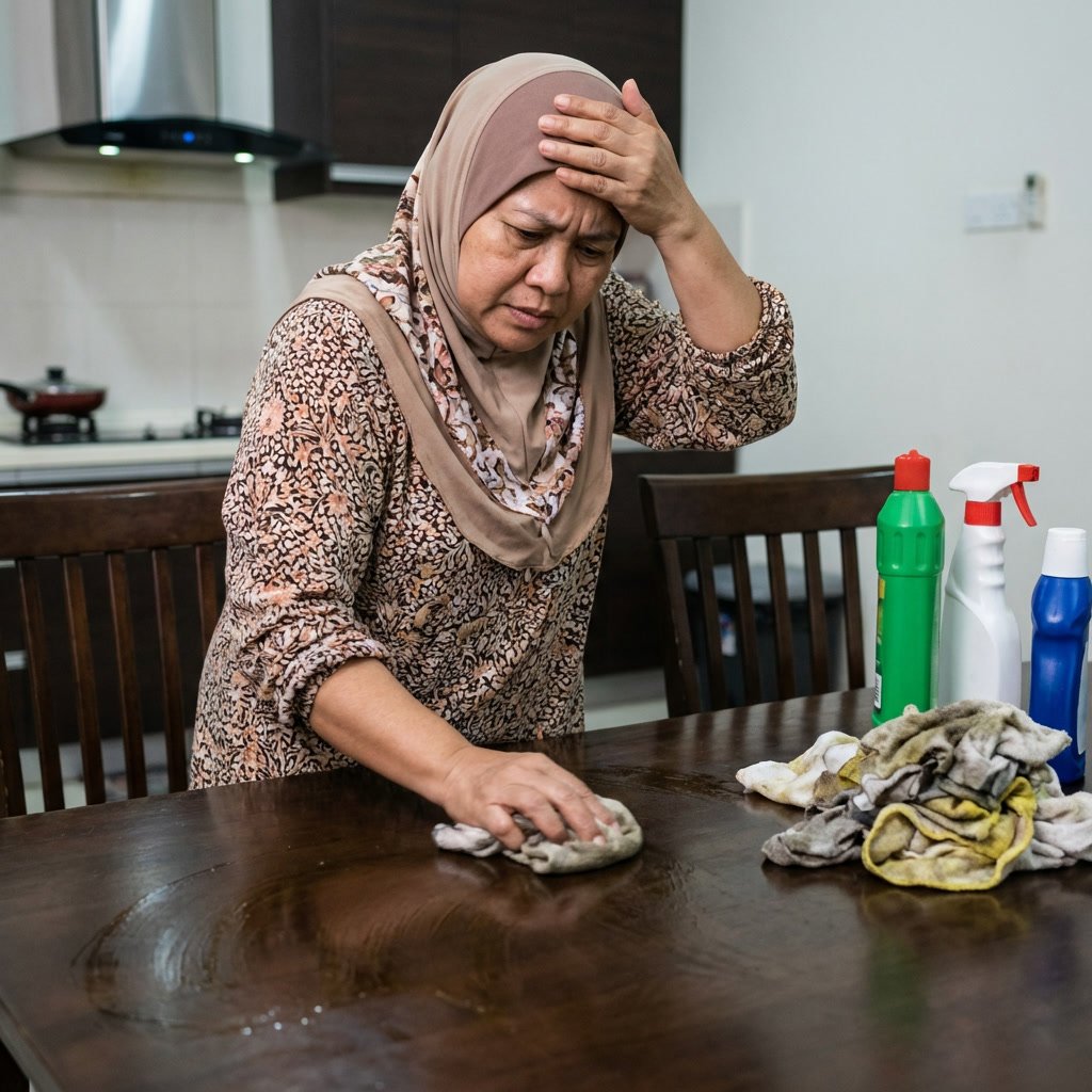 ❌ Lap meja banyak kali tapi kesan minyak masih melekat dan air bertakung?
